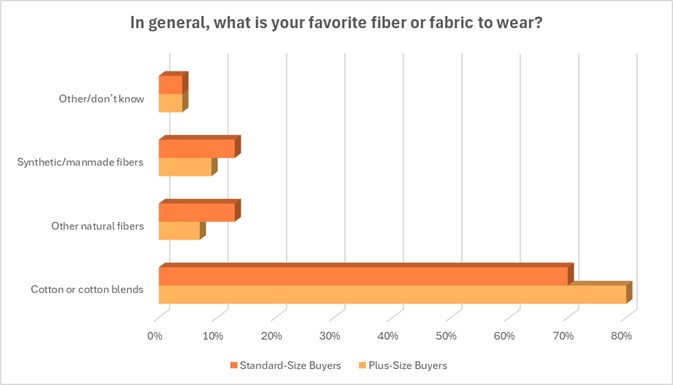 Plus-size shoppers also seek the natural comfort and breathability of cotton. Fully 8 in 10 plus shoppers say cotton or cotton blends are their favorite, according to the 2024 Sizing survey. That compares to 70 percent of non-plus shoppers.