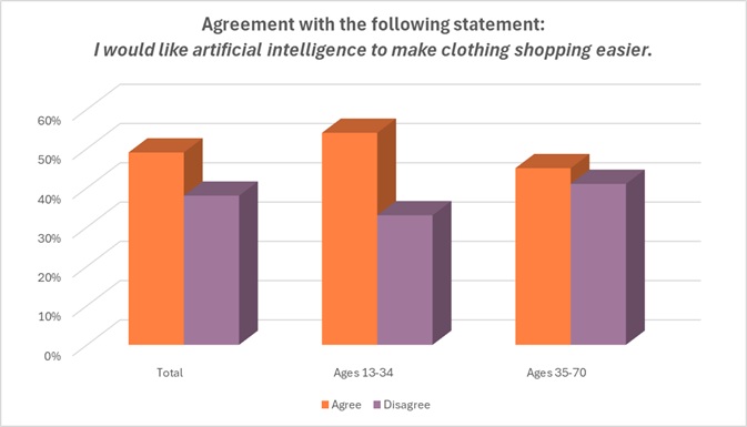 Companies that use AI can also endear themselves to consumers. Consider that more than half of all shoppers (54 percent) say they are impressed when companies use artificial intelligence to help them find products they like, according to the Cotton Incorporated 2024 Lifestyle Monitor™ Survey. The survey completes 500 interviews per month with U.S. consumers between the ages of 13 and 70.