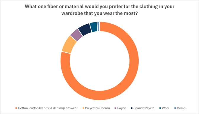 These economic numbers are driven by cotton’s global popularity. Fully 75 percent of consumers across 13 countries prefer the clothing they wear most to be made of cotton, cotton blends or denim, according to Cotton Council International (CCI) and Cotton Incorporated’s 2025 Global Lifestyle Monitor™ (n=13,026 people). These three fabrics are overwhelmingly preferred over manmade fibers including polyester (7 percent), spandex (5 percent) and rayon (4 percent). Cotton also eclipses natural fibers like wool (3 percent) and hemp (1 percent).