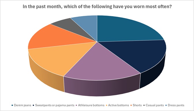 Among these many bottoms choices, the most popular with U.S. consumers this year is denim jeans. From March through September, nearly 40 percent of U.S. consumers say they’ve worn jeans most often, according to Cotton Incorporated’s 2025 Consumer Sentiment Survey (n=3,899 U.S. consumers, Waves 1-4). Besides denim, the top bottoms choices are sweatpants and pajamas (29 percent), athleisure bottoms (27 percent), active bottoms (24 percent), and shorts (23 percent), followed by casual and dress pants (both 12 percent).