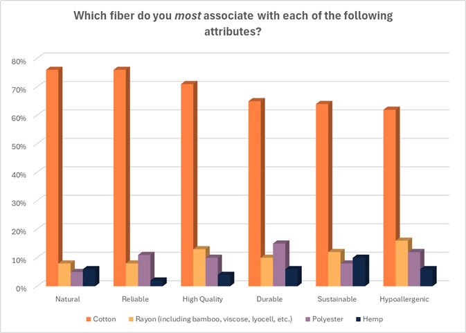 American consumers overwhelmingly say organic cotton (82 percent), recycled cotton (80 percent) and conventional cotton (78 percent) are safe for the environment, according to the 2026 Global Sustainability Survey. Further, shoppers say cotton is the most natural (76 percent), sustainable (64 percent) and highest quality (71 percent) fiber. And nearly two-thirds (63 percent) say cotton fibers do not contribute to microplastic pollution, according to Cotton Incorporated’s 2025 Microplastics Survey of 969 U.S. respondents.